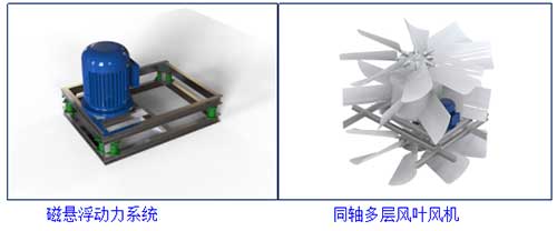 為盡量降低冷卻塔本體的風機噪聲,采用同軸多層風葉超靜音風機(21片),經(jīng)鈍化處理的鋁合金葉片具有耐化學性腐蝕的特性。該風機的原理是降低轉速(120轉)增加風量,同比普通風機可以達到降噪接近20dB(A) 的效果,為滿足更加嚴格的降噪條件開創(chuàng)了新的標準。